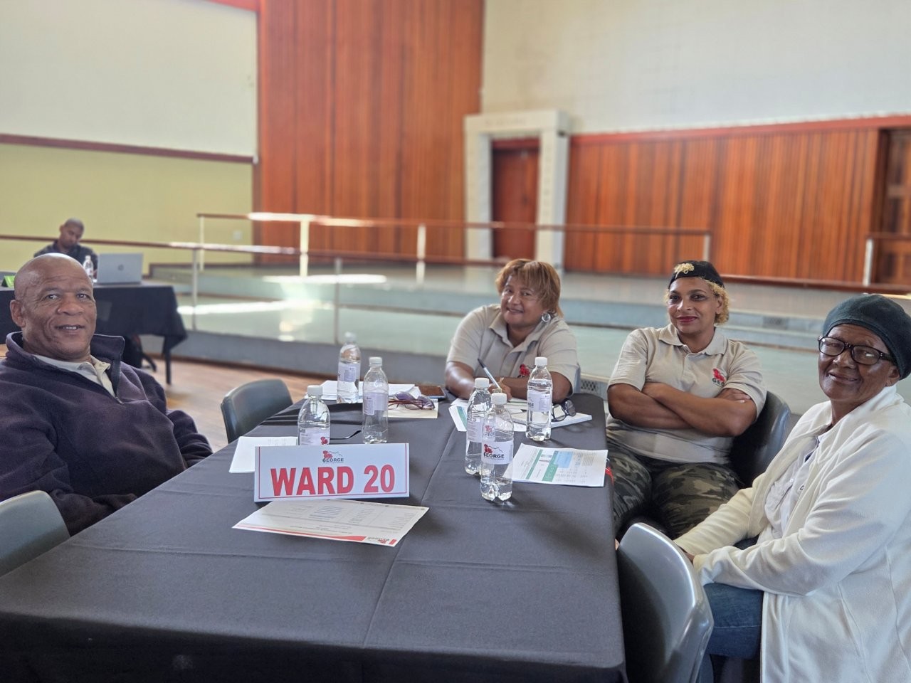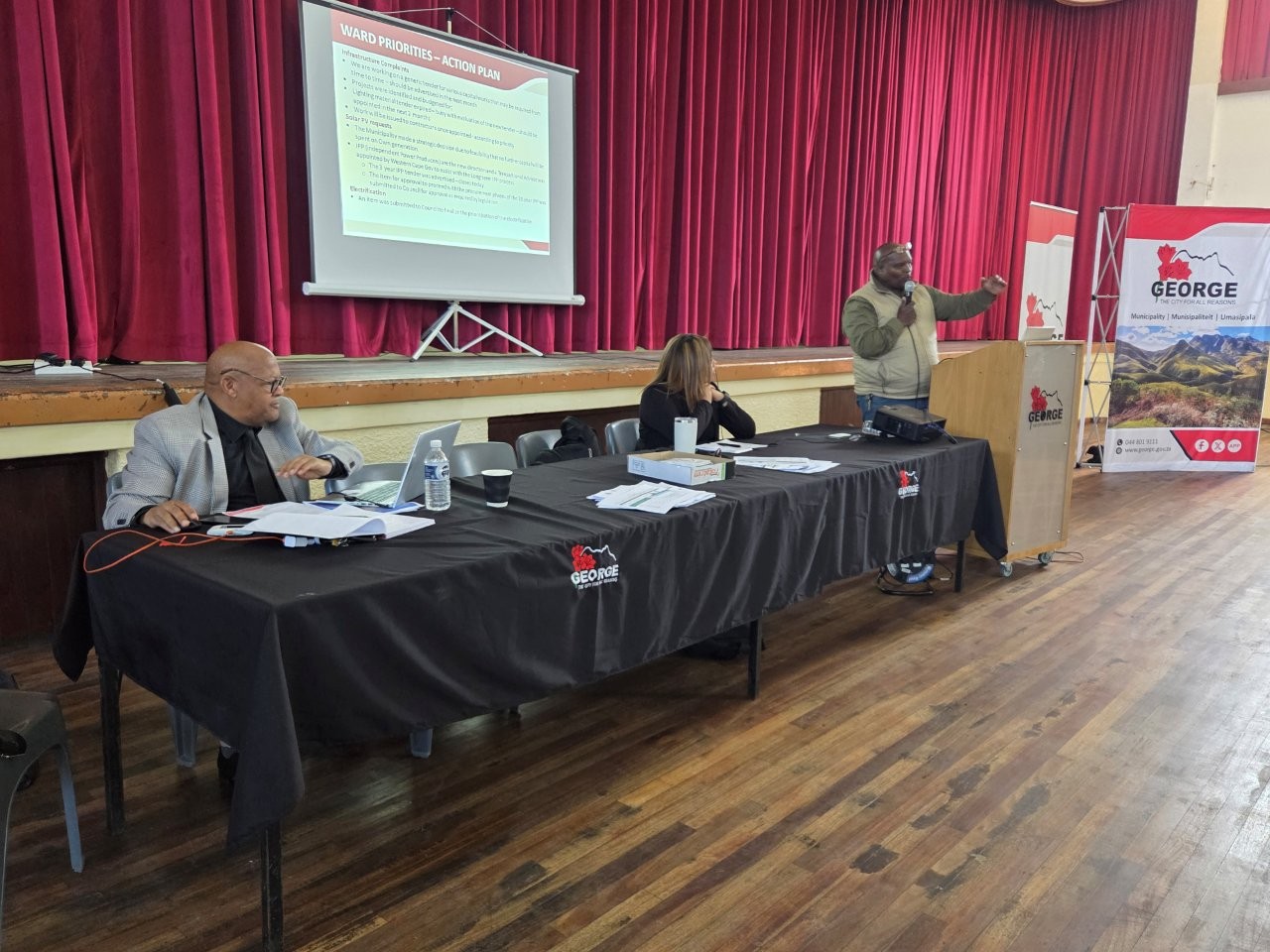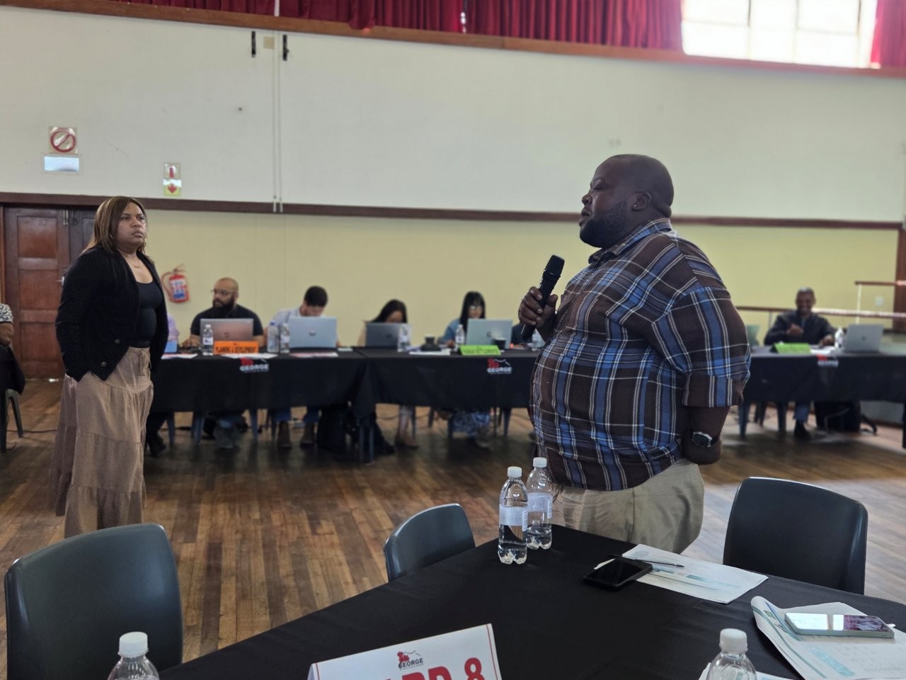Rudy Booysen from Ward 8 asks a question at the Conville public participation meeting, while Ronél Valla from IDP, Strategic Growth and Development looks on.