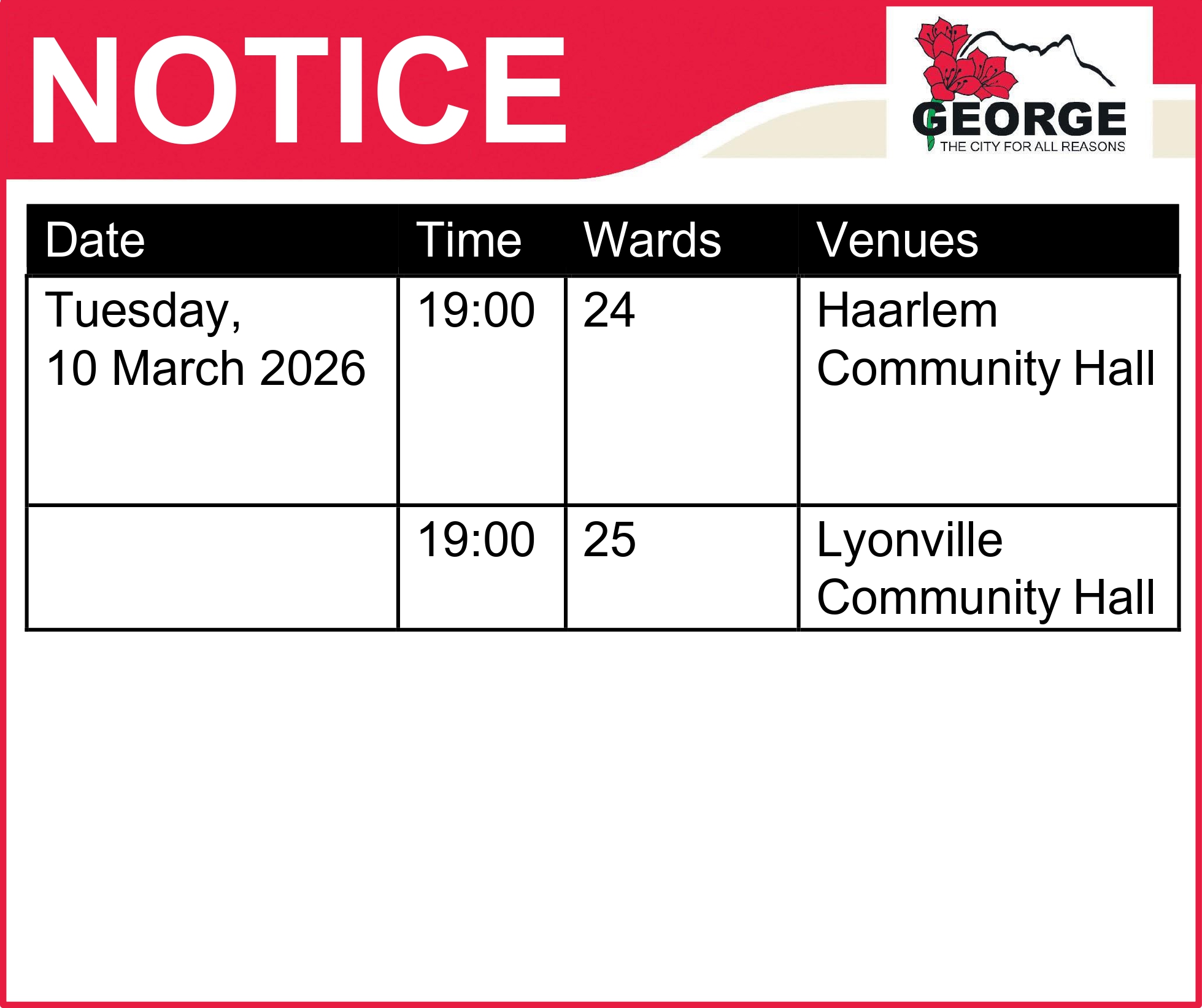 Residents are invited to take part in the upcoming George Municipal Public Participation meetings regarding the Electricity Cost of Supply study and resultant proposed electricity tariff structures for the 2026–2027 financial year. These sessions provide an opportunity for community members to learn more about the proposed tariffs, ask questions and share their input.