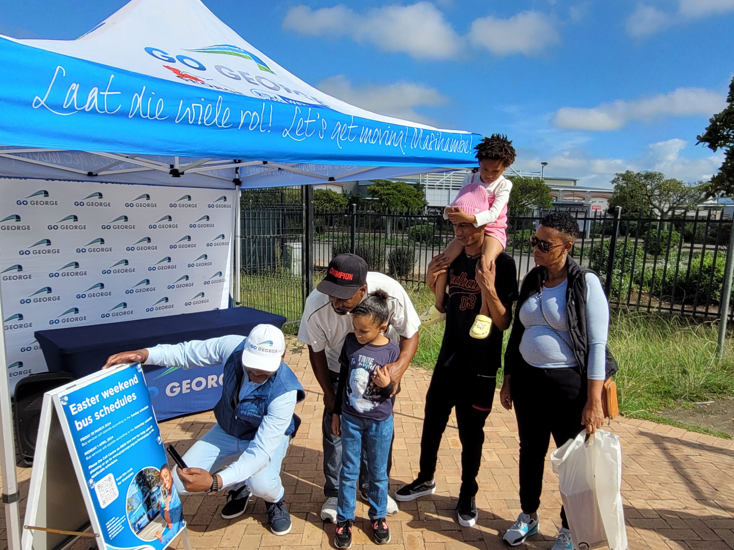In the photo: Tyron Jeyi, GO GEORGE Community Liaison Officer, demonstrates to the Meyer family of Rosemoor how to scan and use the QR code on a GO GEORGE poster.