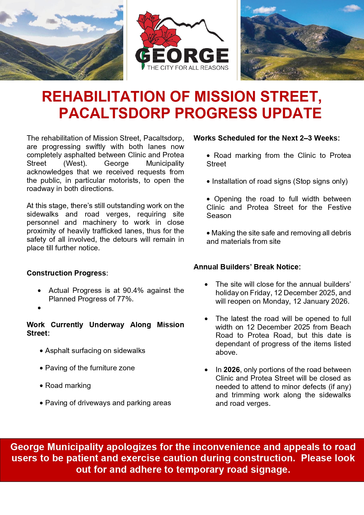 George Municipality is aware of the ongoing water supply issues affecting Wilderness, Kleinkrantz, Hoekwil, and the surrounding areas. We thank everyone who alerted us this morning to which streets/areas remain without water.