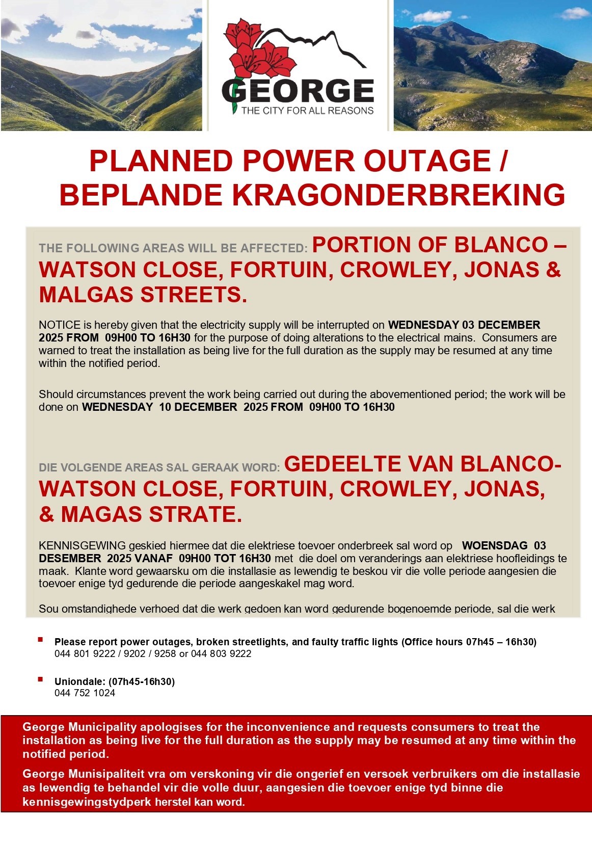 George Munisipaliteit herinner die publiek daaraan dat weens die hoë brandrisiko, die afvuur, en besit van vuurwerke, klappers, fakkels, papierlanterns en ander sulke toebehore in die George munisipale gebied nie toegelaat word nie.