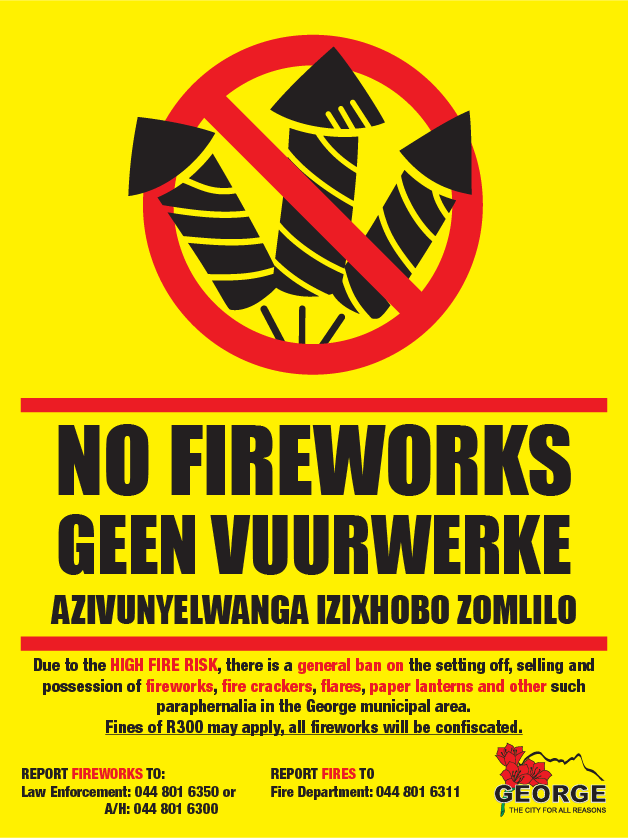 George Municipality reminds the public that, due to the high fire risk, the setting off and possession of fireworks, firecrackers, flares, paper lanterns, and other such paraphernalia in the George municipal area is not allowed.