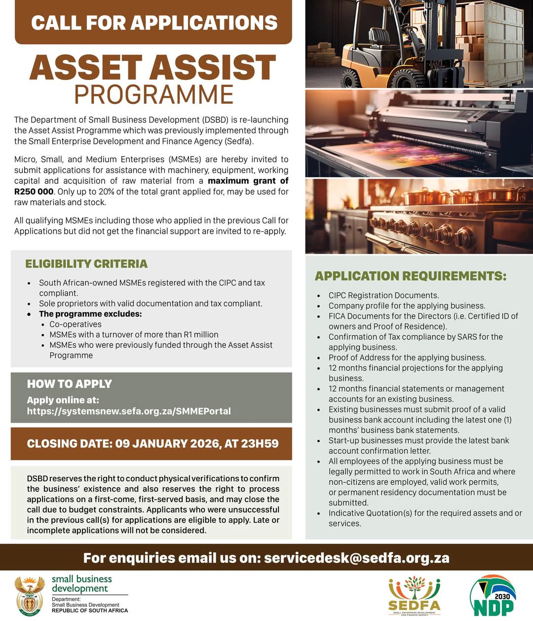 The Department of Small Business Development (DSBD) is re-launching the Asset Assist Programme which was previously implemented through the Small Enterprise Development and Finance Agency (SEDFA).