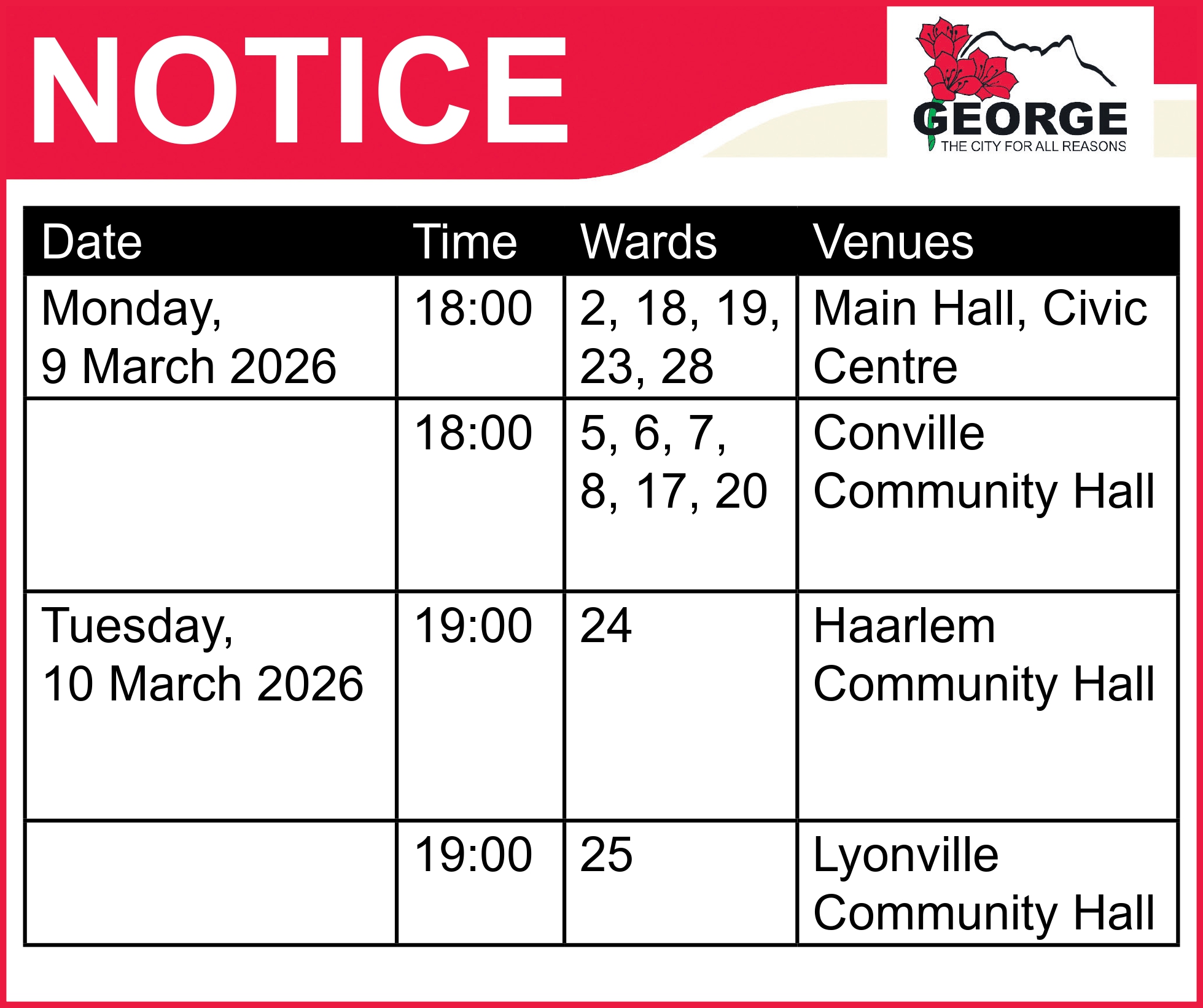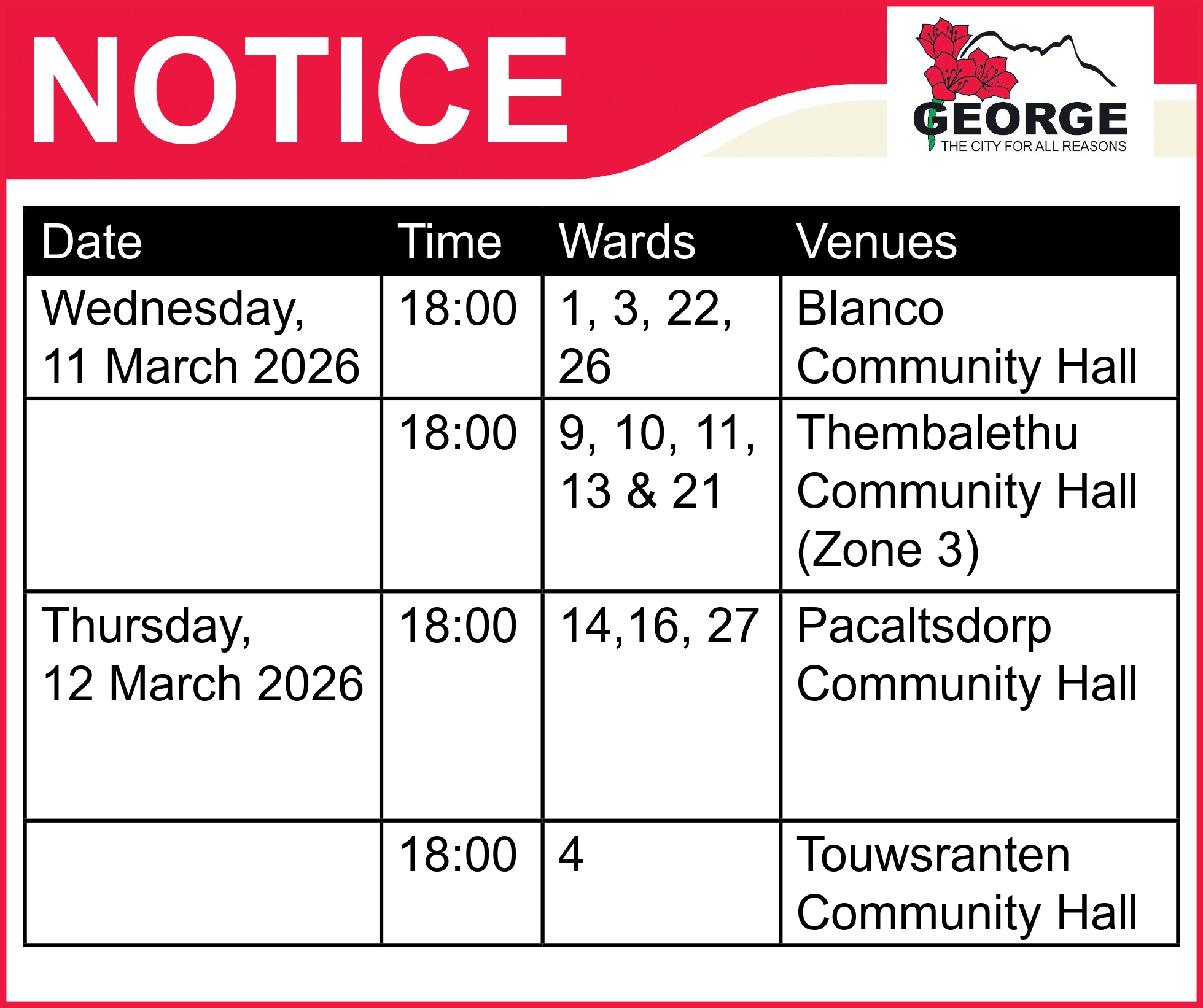 Members of the public are encouraged to attend the meeting scheduled for their ward, where municipal representatives will present information and engage directly with residents.