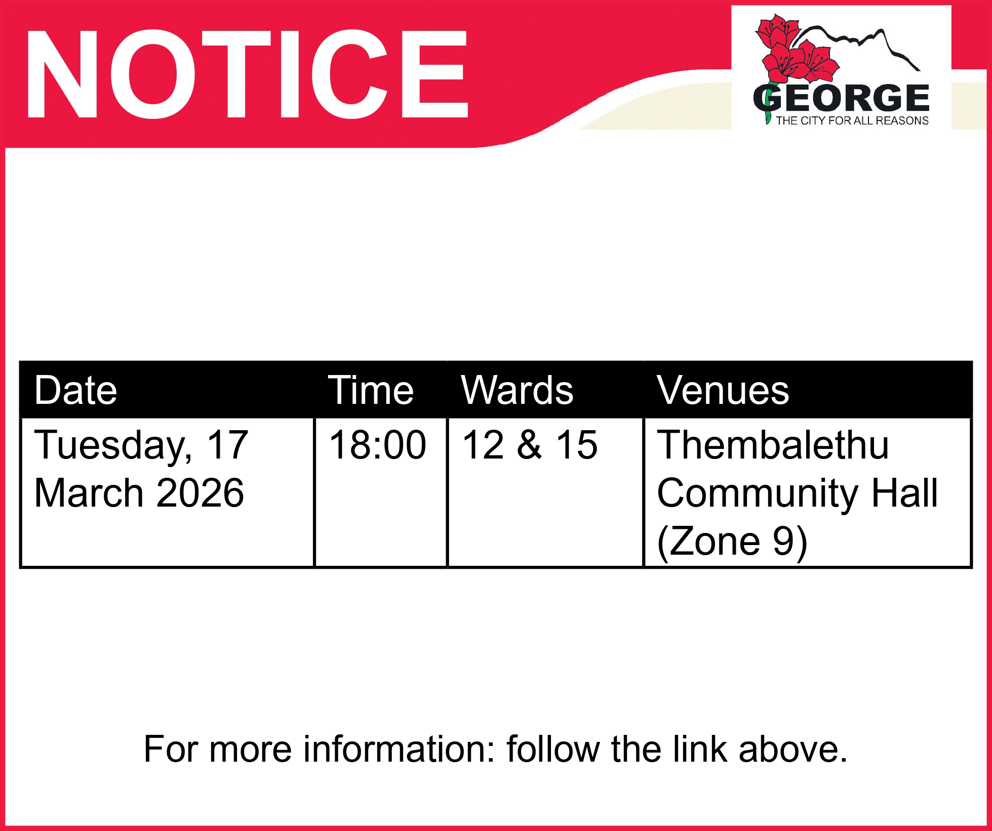 Residents are invited to take part in the upcoming George Municipal Public Participation meetings regarding the Electricity Cost of Supply study and resultant proposed electricity tariff structures for the 2026–2027 financial year. These sessions provide an opportunity for community members to learn more about the proposed tariffs, ask questions and share their input.