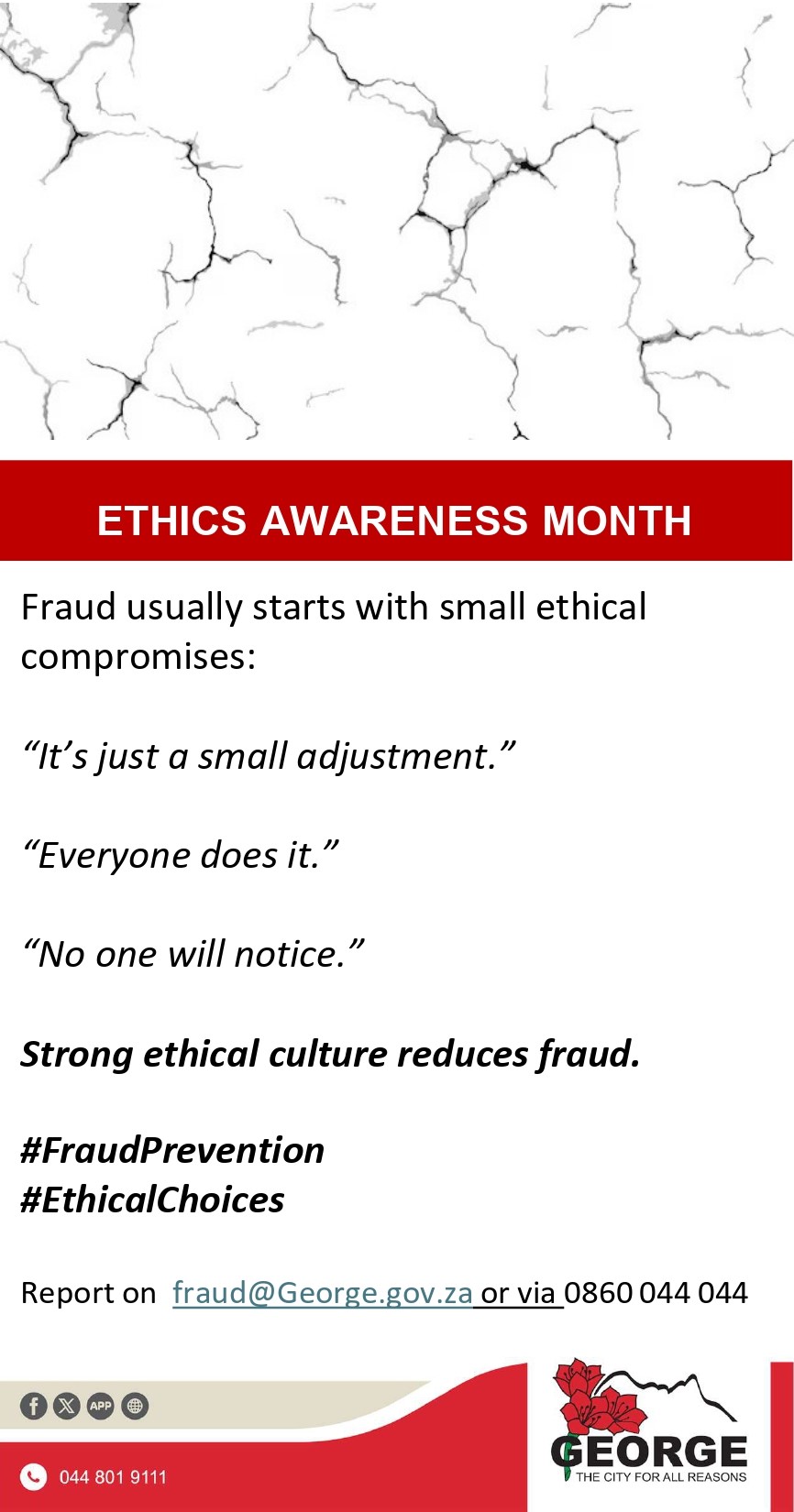 For George Municipality, Ethics Awareness Month serves as a reminder of the importance of upholding the highest standards of honesty, transparency and fairness in serving our community. By strengthening an ethical culture within the organisation, the municipality reaffirms its commitment to good governance, ethical leadership and building public trust.