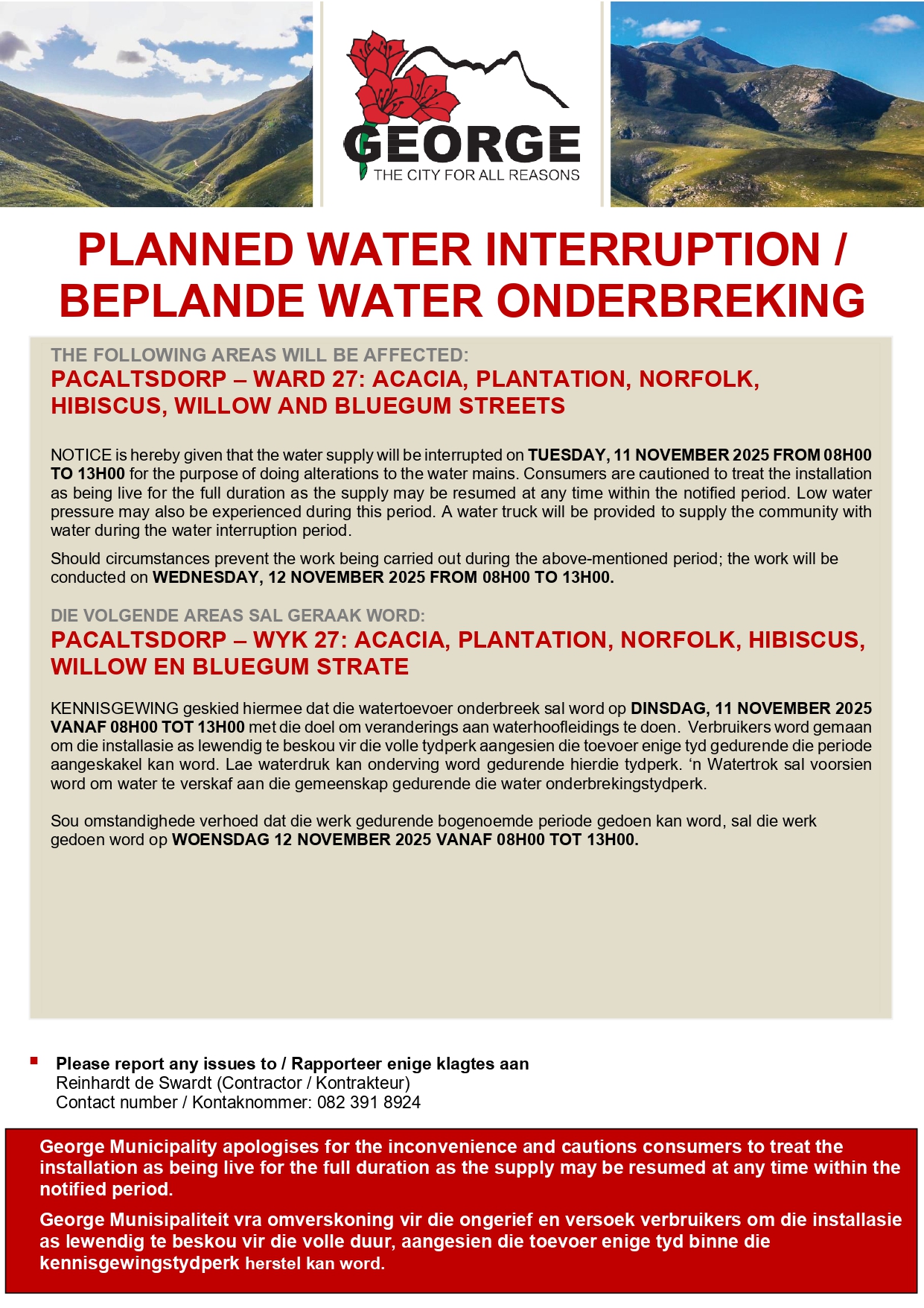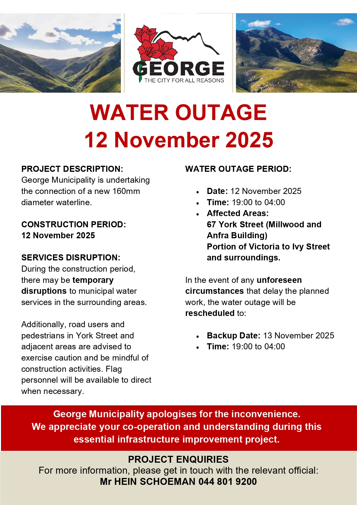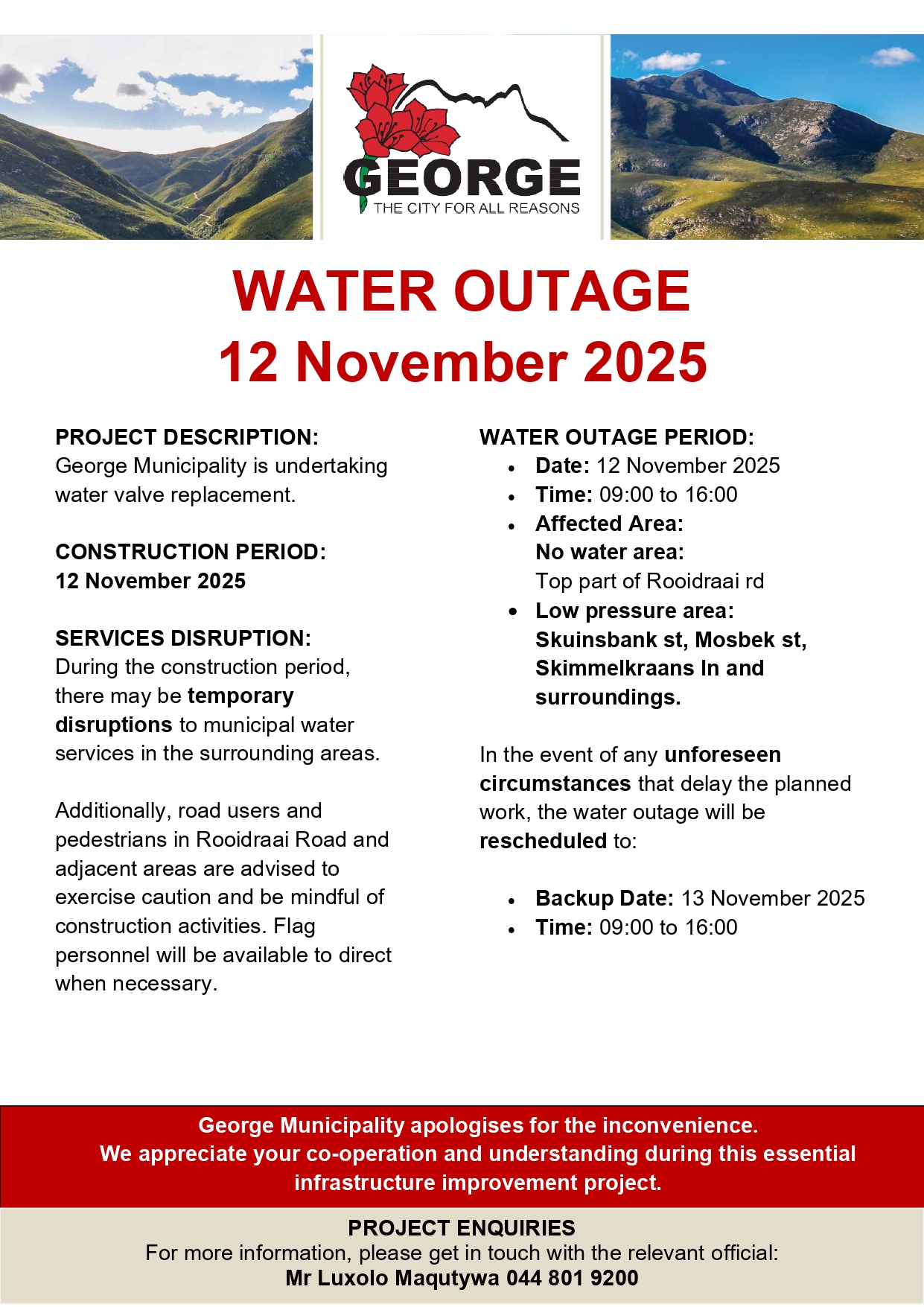 Die Munisipaliteit vra om verskoning vir die ongerief en dank inwoners vir hul geduld.