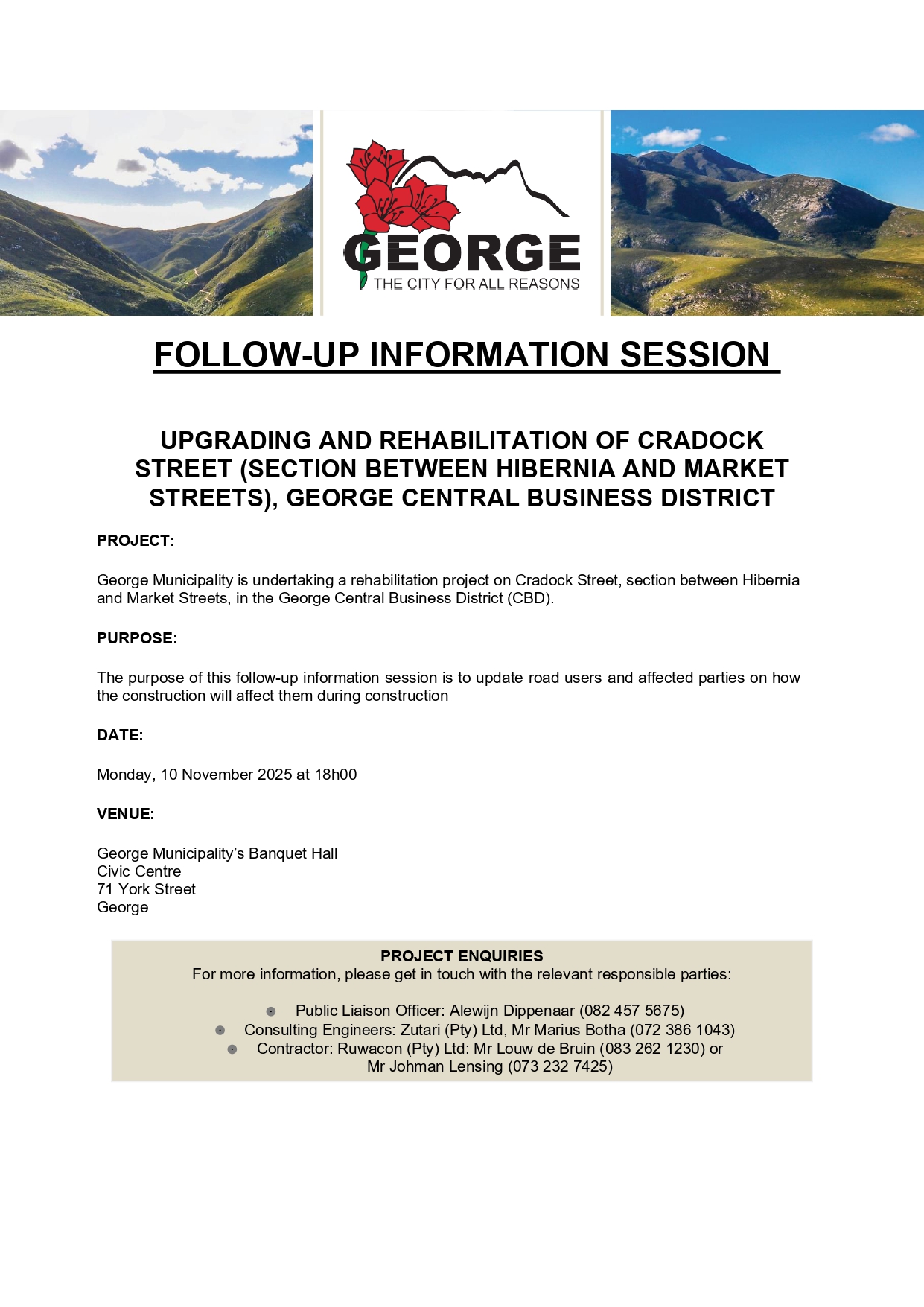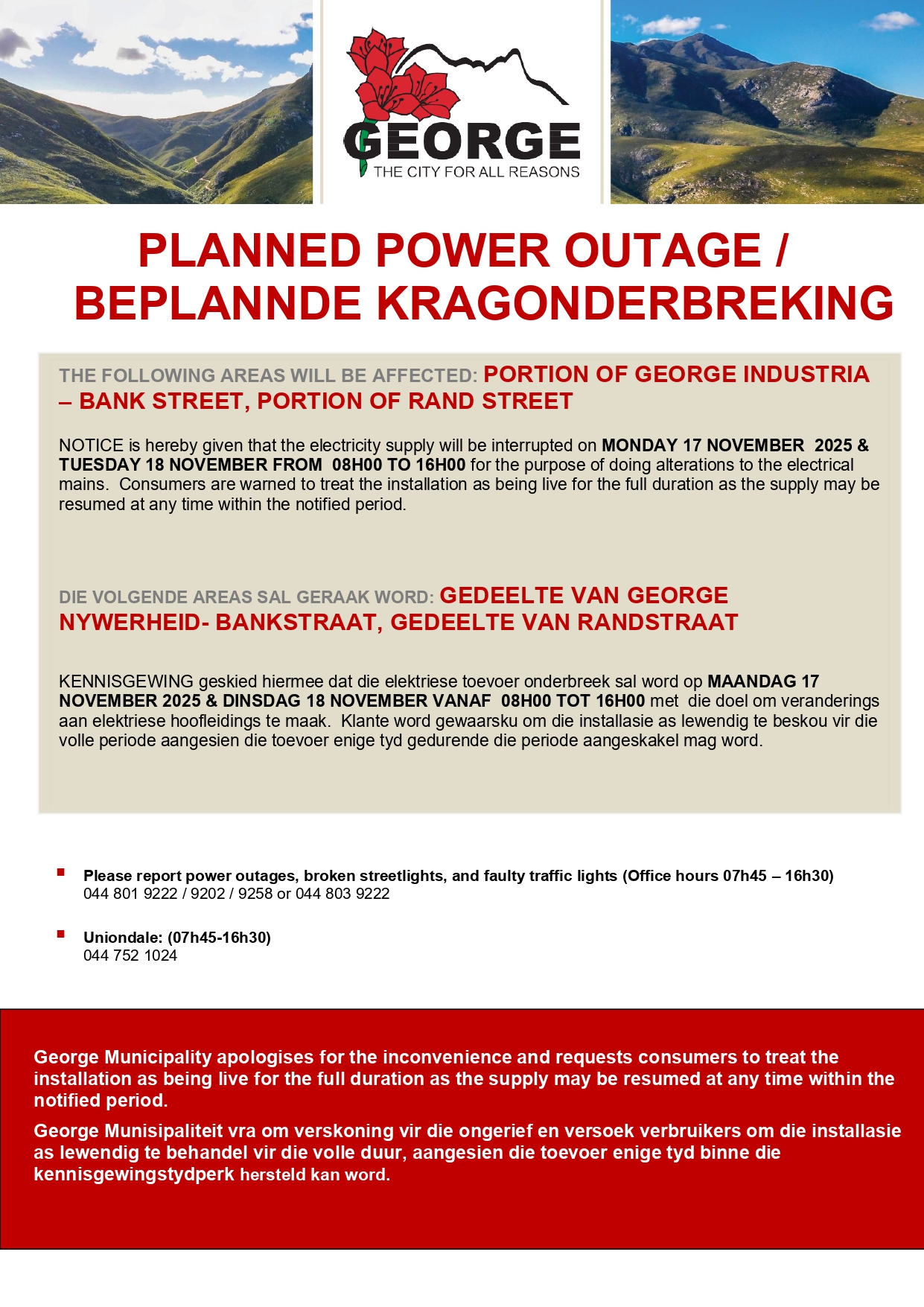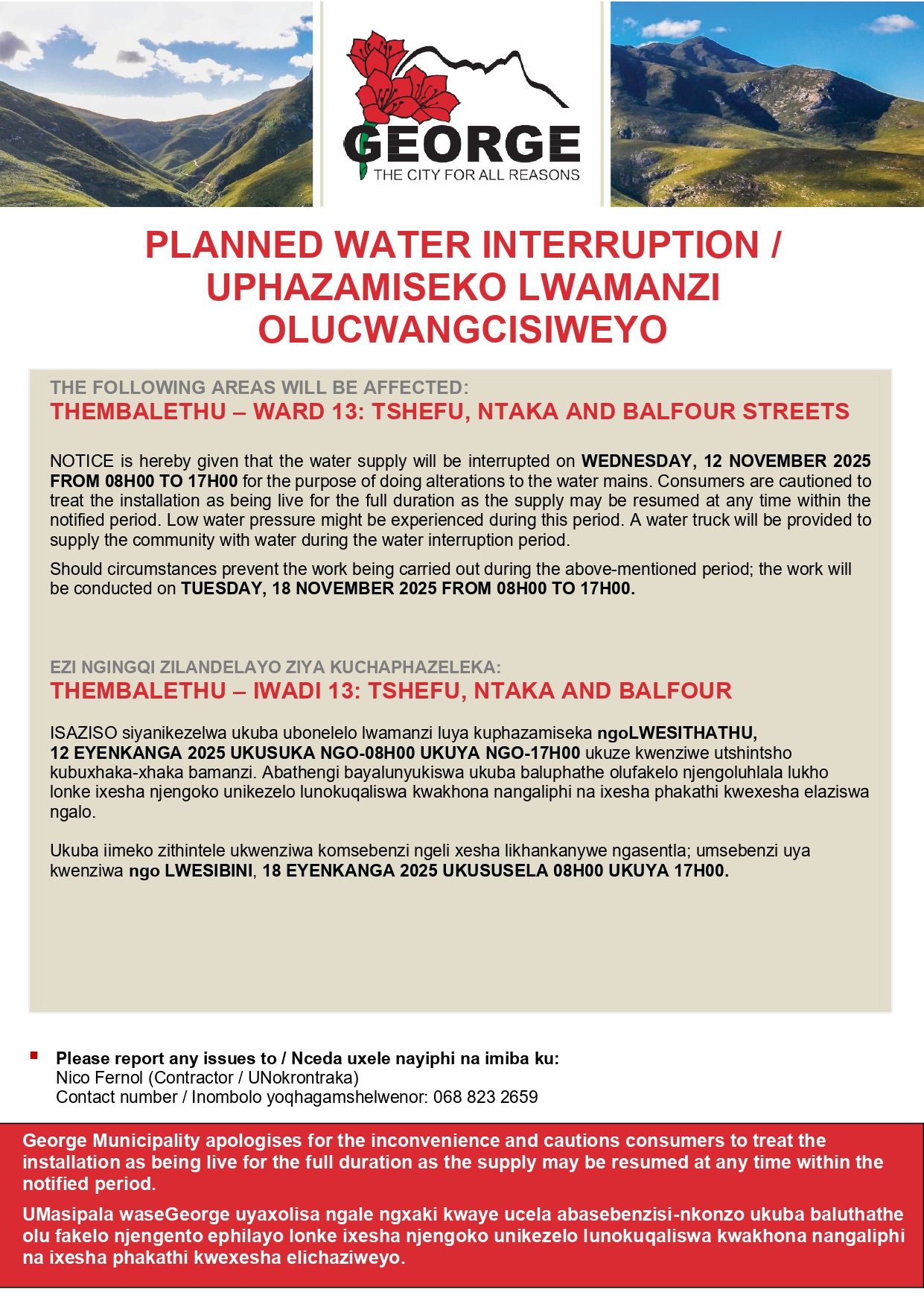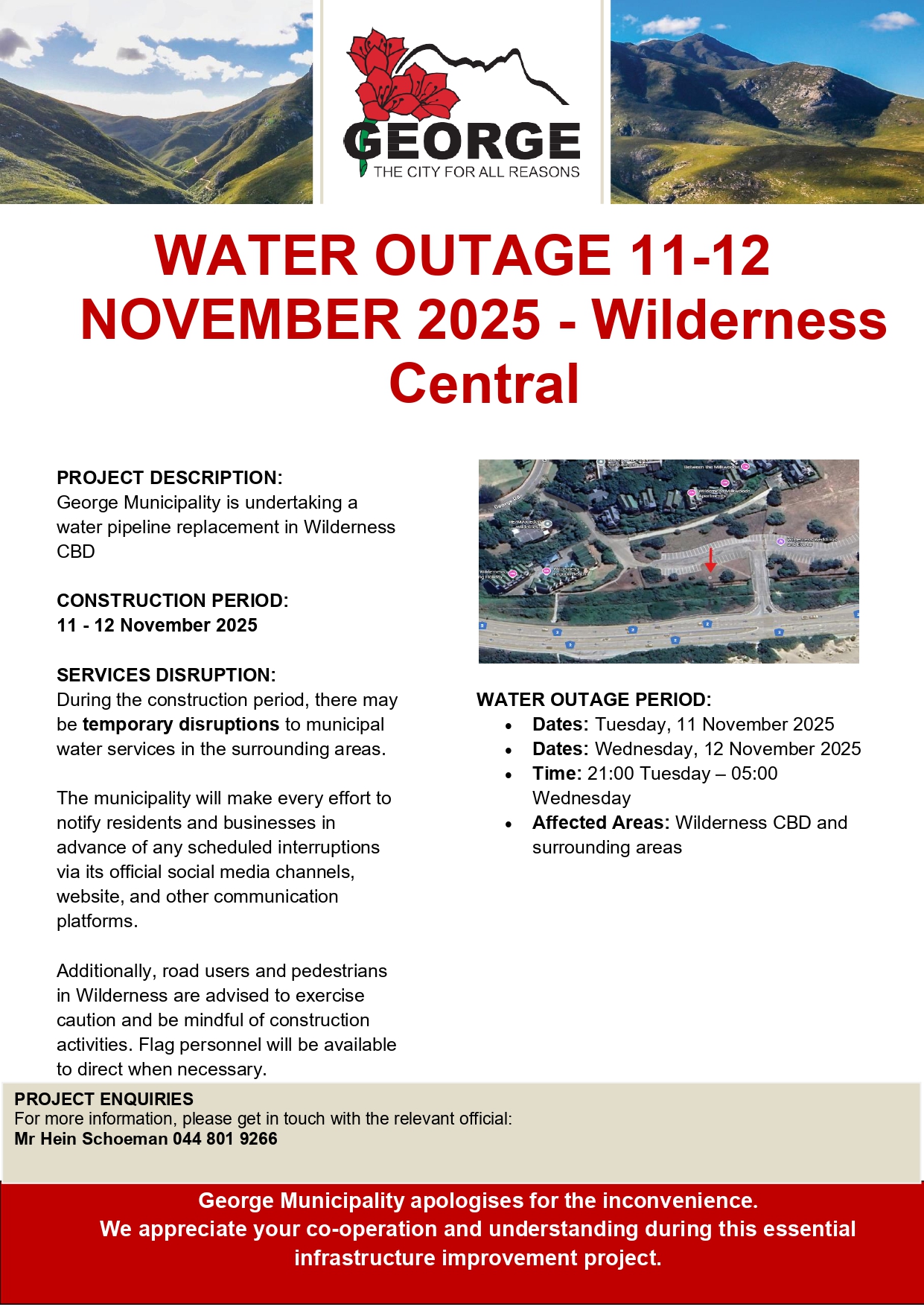 Die Munisipaliteit vra om verskoning vir die ongerief en dank inwoners vir hul geduld.
