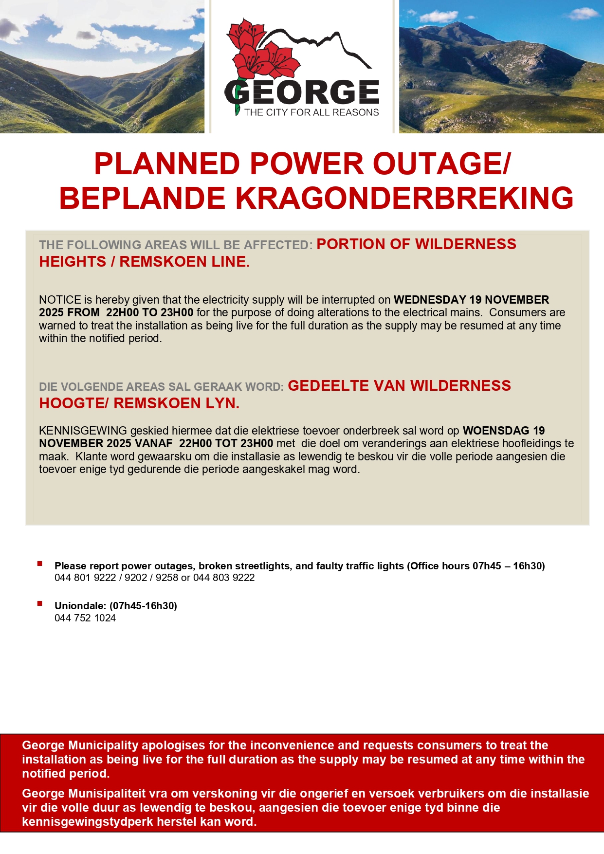 Planned power outage: Wilderness Heights (change in times since the previous notice)