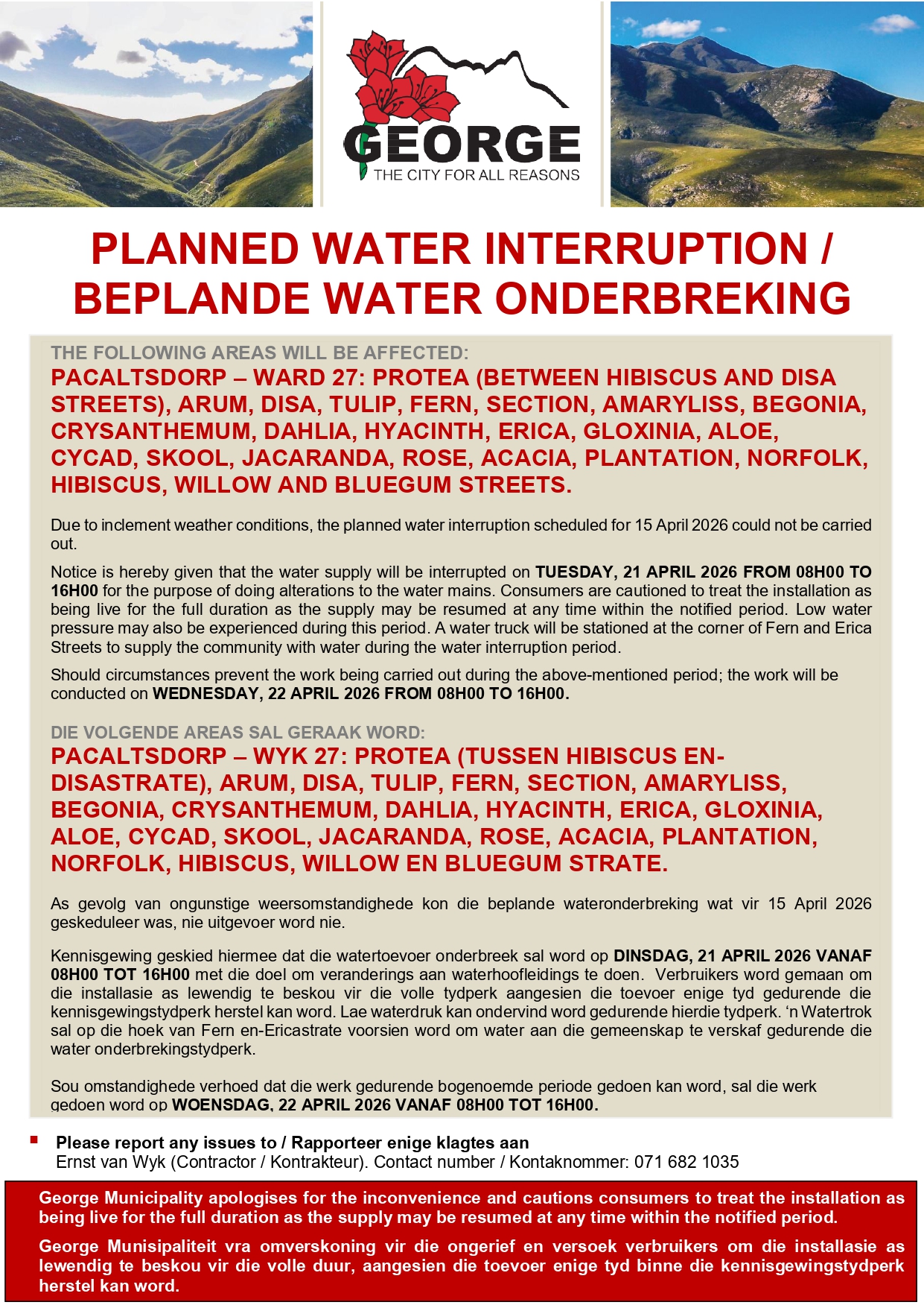 Planned water interruption – part of Pacaltsdorp