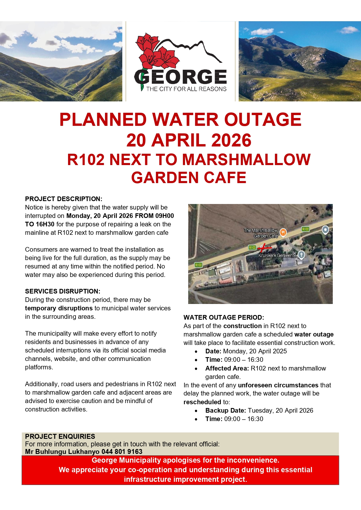 Change of date: Planned water outage R102 area next to Marshmallow Café.