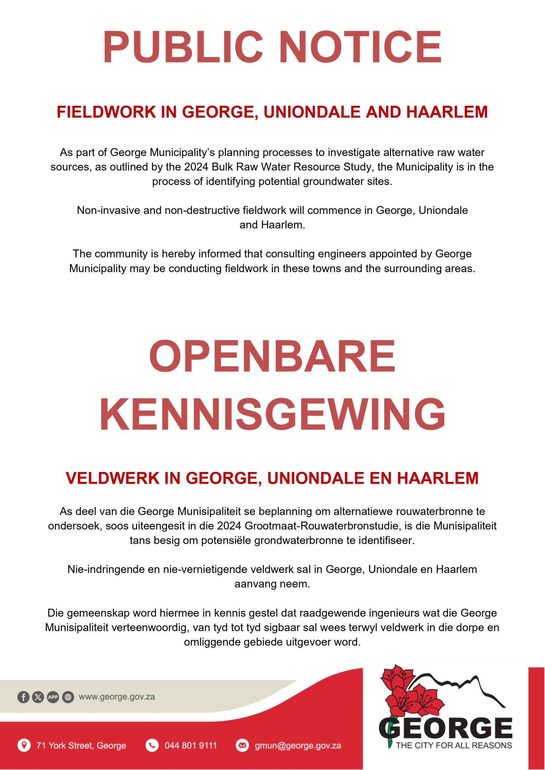 Public Notice: Fieldwork in George, Uniondale and Haarlem for raw water sources