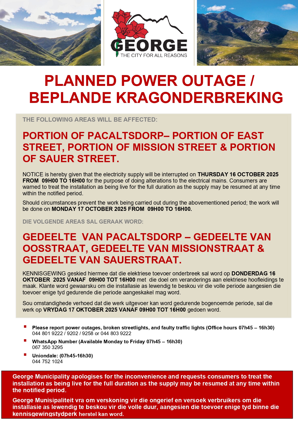 PUBLIC NOTICE: Planned Power Outage Portion of Pacaltsdorp