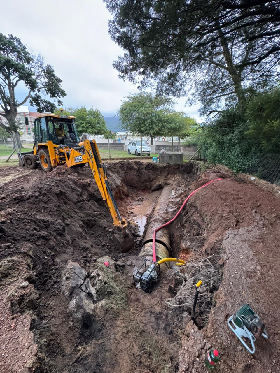At around 23:00 last night the municipality was alerted of a pipe burst on the 1000mm diameter bulk water pipeline at the Tennis Courts at CJ Langenhoven Road.A team was dispatched and immediately, isolated the pipeline and started excavations to locate the damaged section.