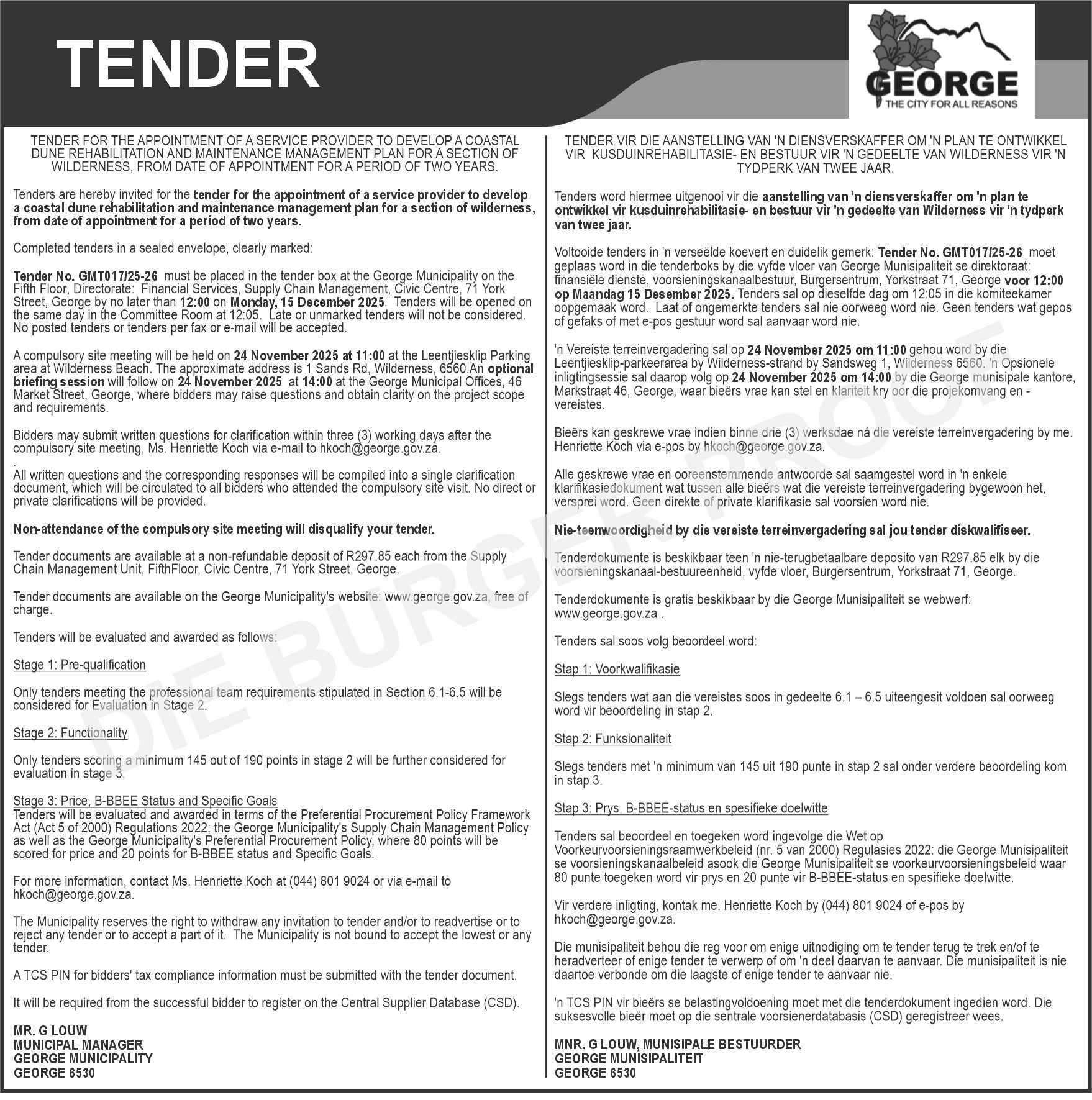 GMT017/25-26: Tender for the appointment of a service provider to develop a coastal dune rehabilitation and maintenance management plan for a section of wilderness, for two years, from date of appointment.