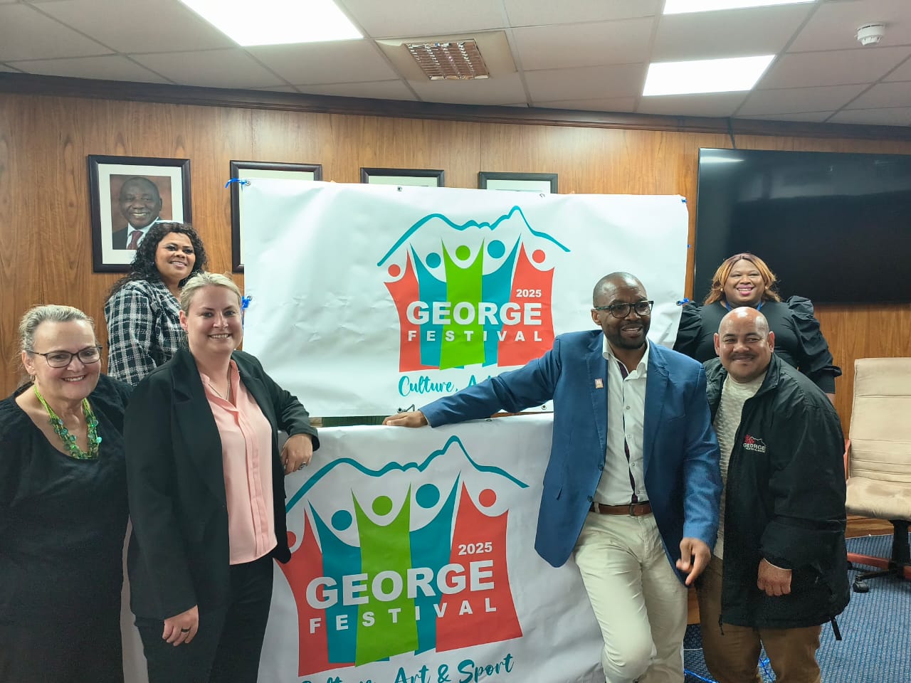 Proudly launching the official George Festival 2025 logo — a vibrant symbol of our city’s energy, creativity, and unity — are (from left) Joan Shaw (George Tourism Manager), Mayor Jackie von Brandis, Chief Whip Teresa Jeyi, Western Cape MEC for Cultural Affairs and Sport Recardo Mackenzie, MMC for Social Development Melvin Roelfse, and Khanyisile Fortuin (Social Development).